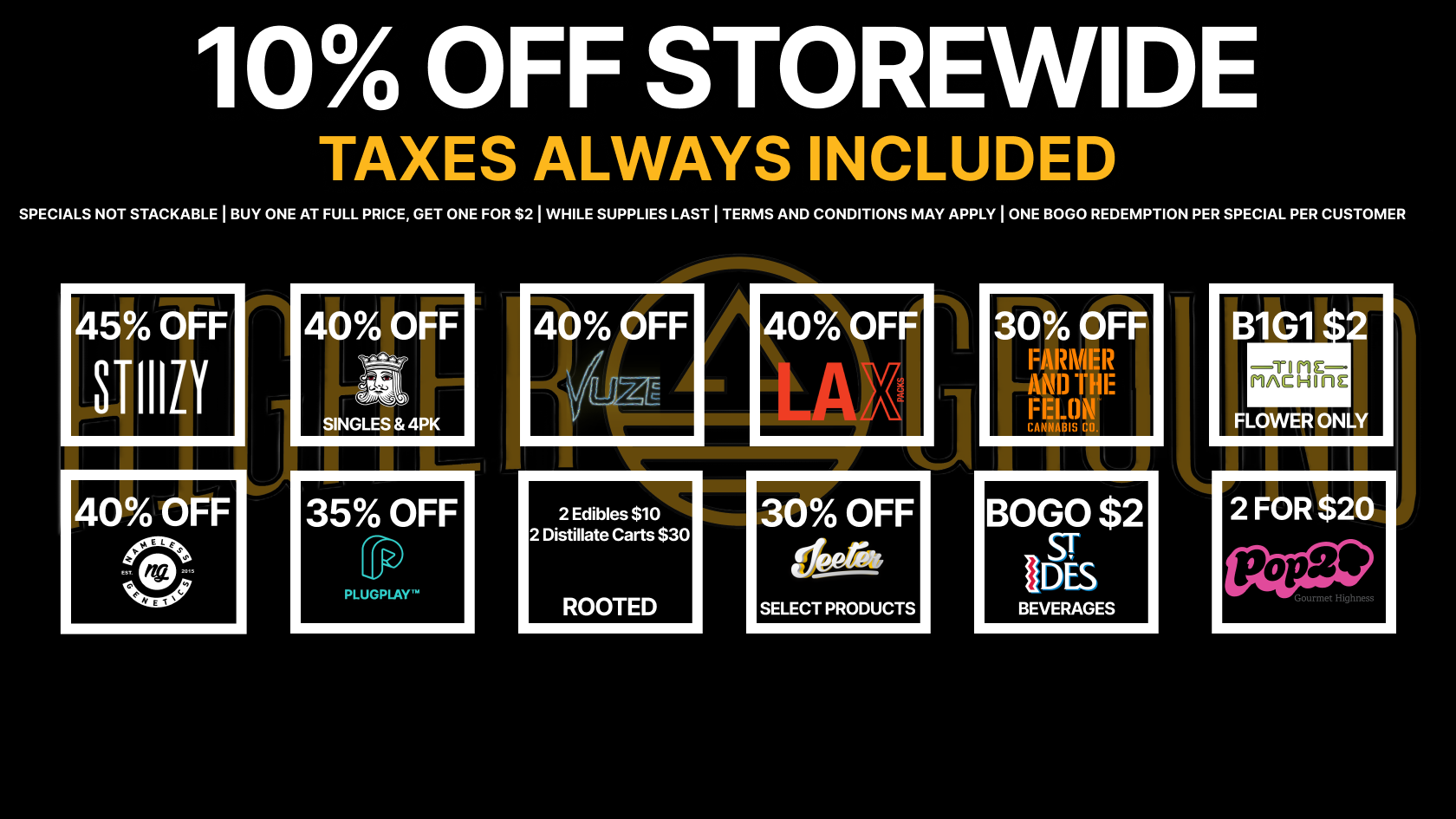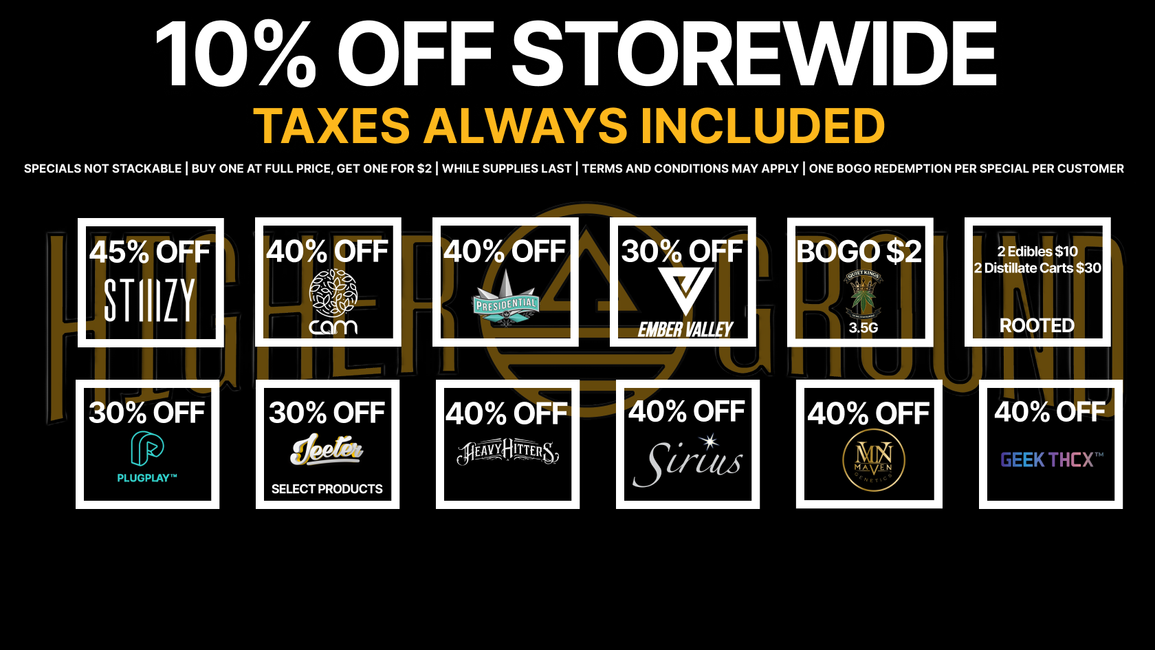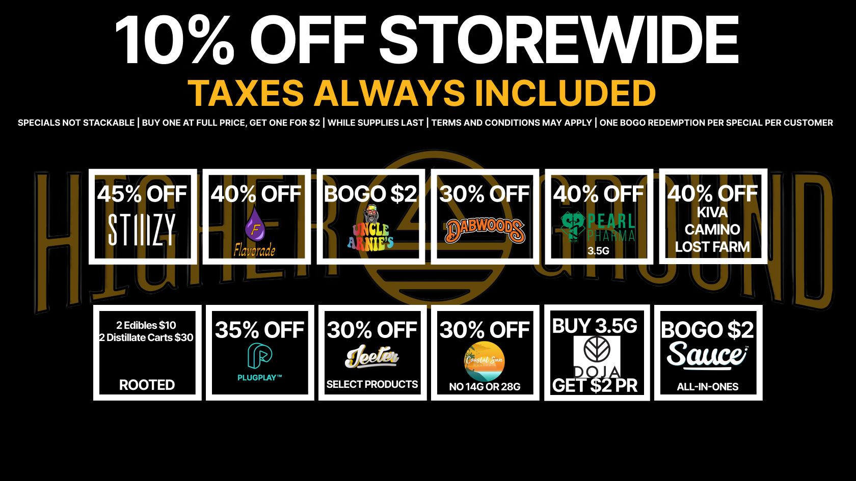 Unlock the best cannabis deals in Baldwin Park at Higher Ground! Our curated selection of cannabis products feature top-quality products at unbeatable prices. From flower to accessories, find everything you need for an elevated experience.