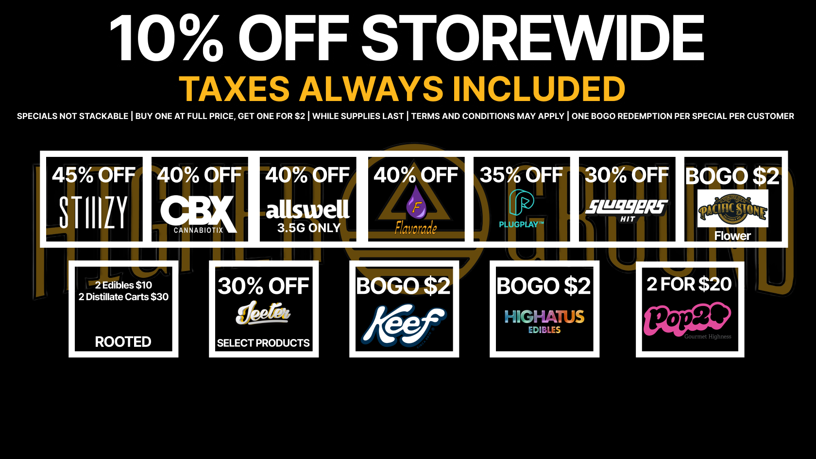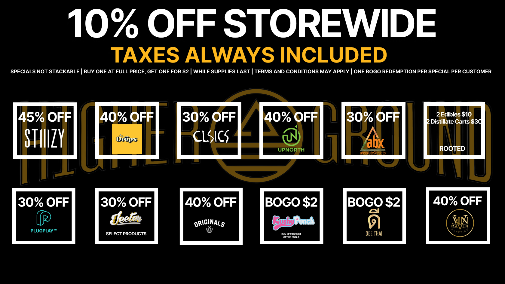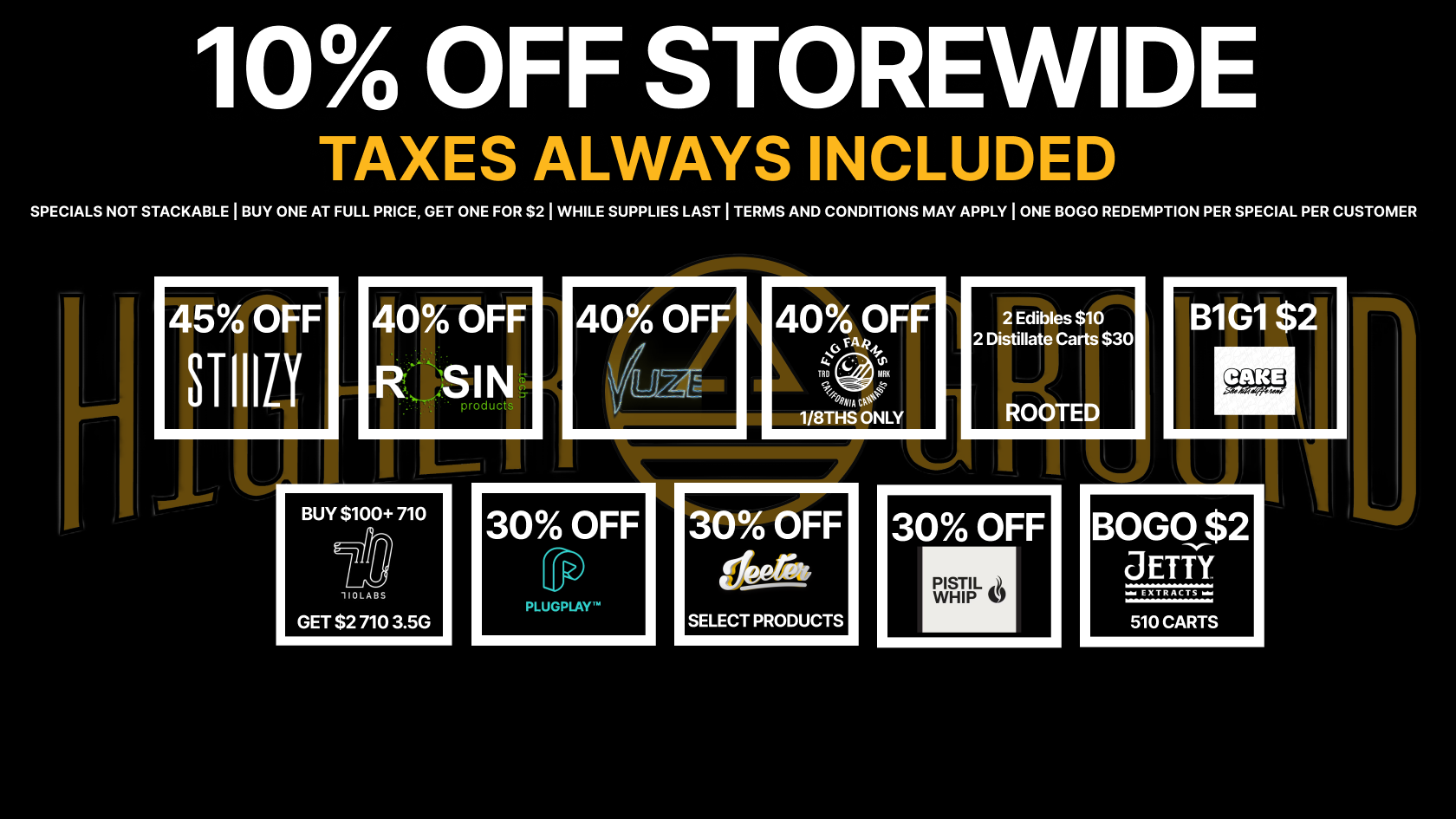 Unlock the best cannabis deals in Baldwin Park at Higher Ground! Our curated selection of cannabis products feature top-quality products at unbeatable prices. From flower to accessories, find everything you need for an elevated experience.